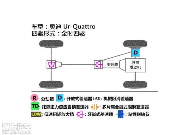 Quattro是世界上第一款装备了全时四驱系统的跑车。它的四驱系统设计理念同lltis如出一辙:没有笨重的分动箱和单独向前轴输送动力的传动轴,整个全时四驱系统被设计得十分紧凑。