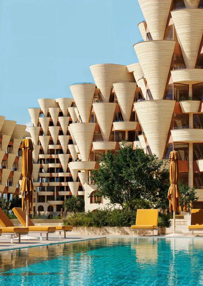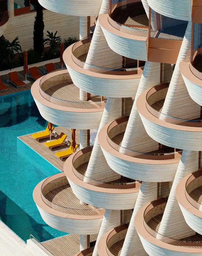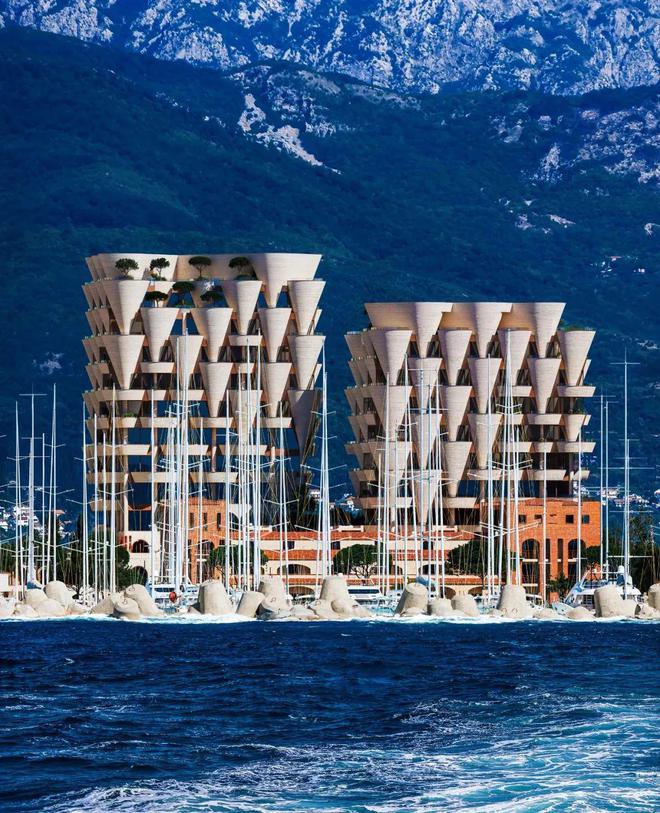 项目毗邻奥里库姆游艇码头,其核心创新在于模块化倒锥形雕塑结构——这些锥体既是观景阳台,亦兼具绿植容器与遮阳系统功能,使建筑与海岸自然共生。
